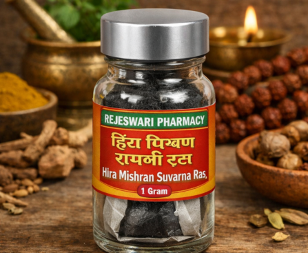 Hira Mishran Suvarna Ras by Rajeswari Pharmacy is a premium classical Ayurvedic herbo-mineral formulation crafted according to traditional Rasashastra principles. This powerful rasayan is known for its rejuvenating, strengthening, and vitality-enhancing properties. It is carefully prepared using purified minerals and precious ingredients to ensure safety, potency, and therapeutic effectiveness. for contact whatsap call6284854469 Key […]
