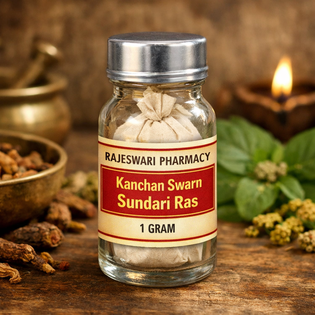 Kanchan Swarn Sundari Ras by Rajeswari Pharmacy is a classical Ayurvedic formulation known for its powerful rejuvenating and vitality-enhancing properties. Prepared according to traditional Ayurvedic principles, this herbal-mineral medicine is formulated to strengthen the body, improve immunity, and support overall health and stamina.