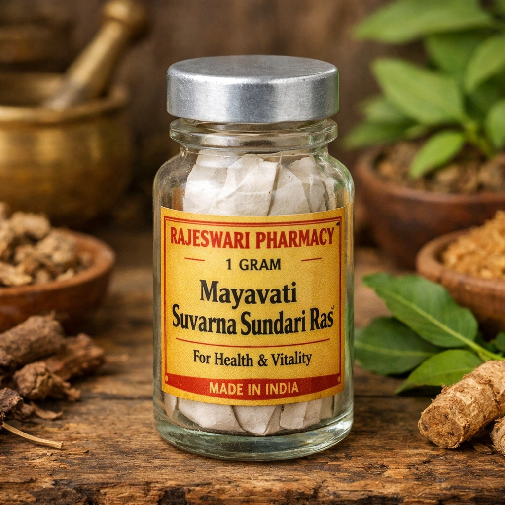 Mayavati Suvama Sundari Ras by Rajeswari Pharmacy is a trusted Ayurvedic preparation designed to support strength, vitality, and overall wellbeing. When used responsibly under professional guidance, it can be a valuable part of a holistic Ayurvedic health routine.