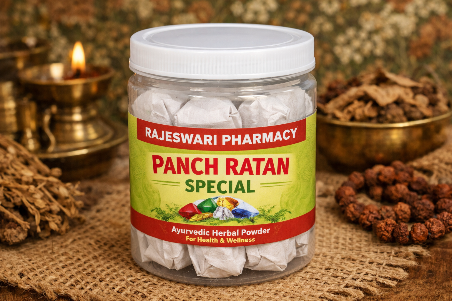 Panch Ratan Special – Rajeswari Pharmacy represents the strength of traditional Ayurvedic Rasayana therapy, designed to promote vitality, endurance, and holistic wellness through time-tested classical wisdom.