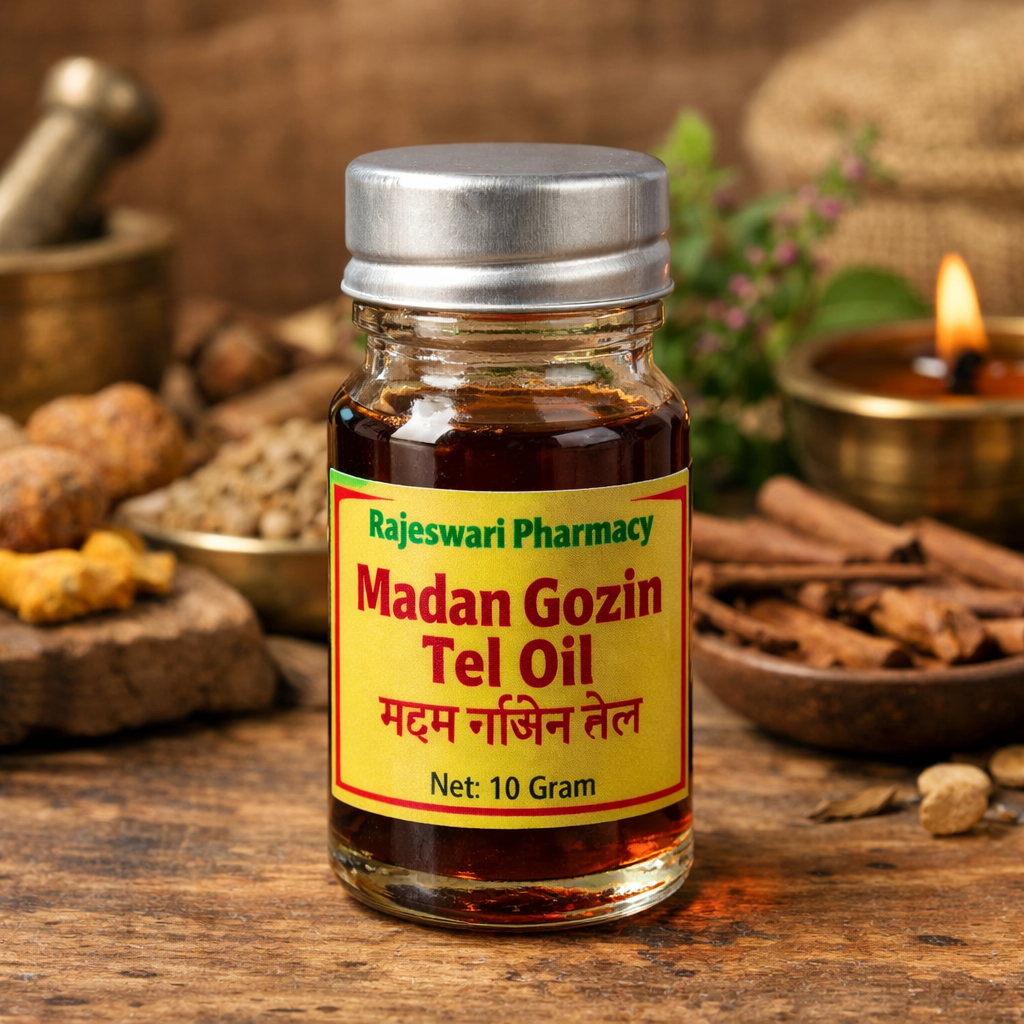 Madan Gozin Tel Oil by Rajeswari Pharmacy is a traditional Ayurvedic herbal oil formulated to support male vitality, strength, and overall reproductive wellness. Prepared using time-tested Ayurvedic principles, this oil is designed for external application to promote stamina, firmness, and improved performance naturally.