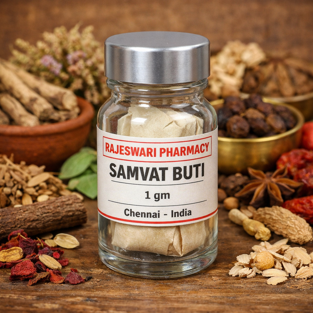 Samvat Buti by Rajeswari Pharmacy is a classical Ayurvedic herbal-mineral formulation prepared with traditional methods and strict quality control. It is formulated to support overall vitality, strength, and balanced body functions according to Ayurvedic principles.