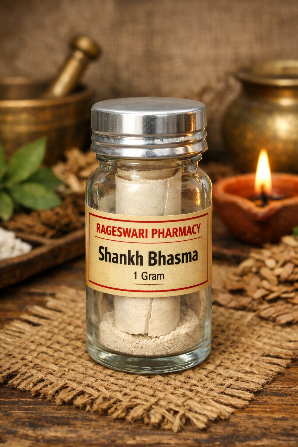 Shankh Bhasma is a classical Ayurvedic mineral preparation made from purified conch shell (Shankha), processed through traditional Shodhana (purification) and Marana (incineration) methods to obtain a fine, bio-assimilable ash. At Rajeswari Pharmacy, Shankh Bhasma is prepared under strict traditional guidelines to ensure purity, potency, and safety.
